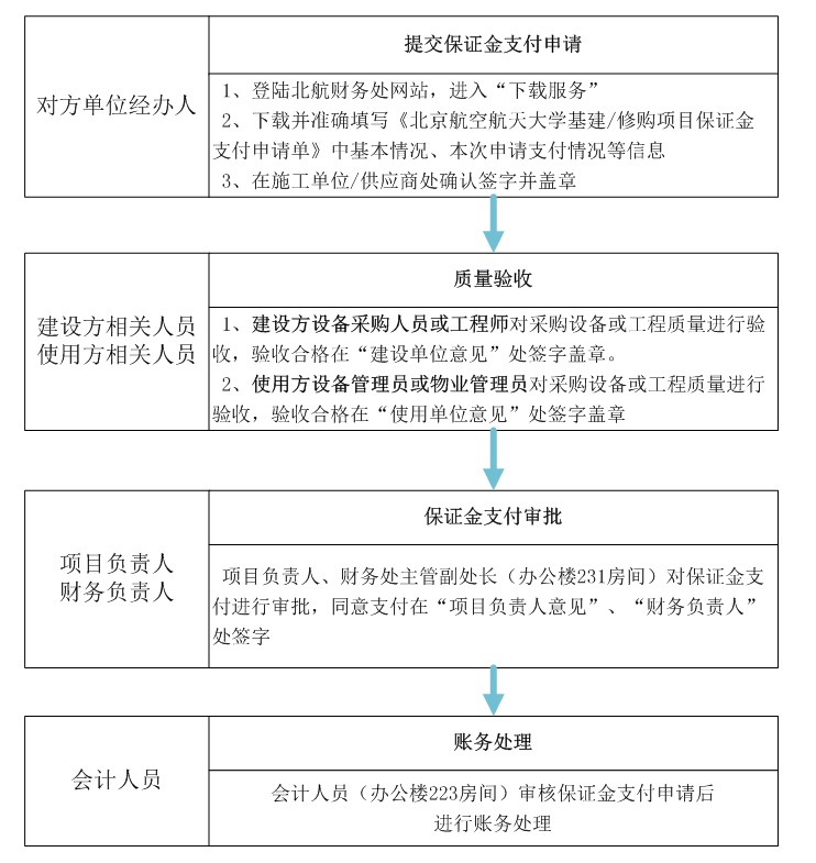 本业务流程适用于我校“基本建设项目”、“条件保障类项目”、“改善基本办学条件专项资金”、“文化产业发展专项”、学校自筹修缮项目及其他参照《基本建设财务规则》(财政部令第81号)管理的项目。保证金包括投标保证金、履约保证金和质量保证金等,具体交纳、退还业务具体流程如下:
